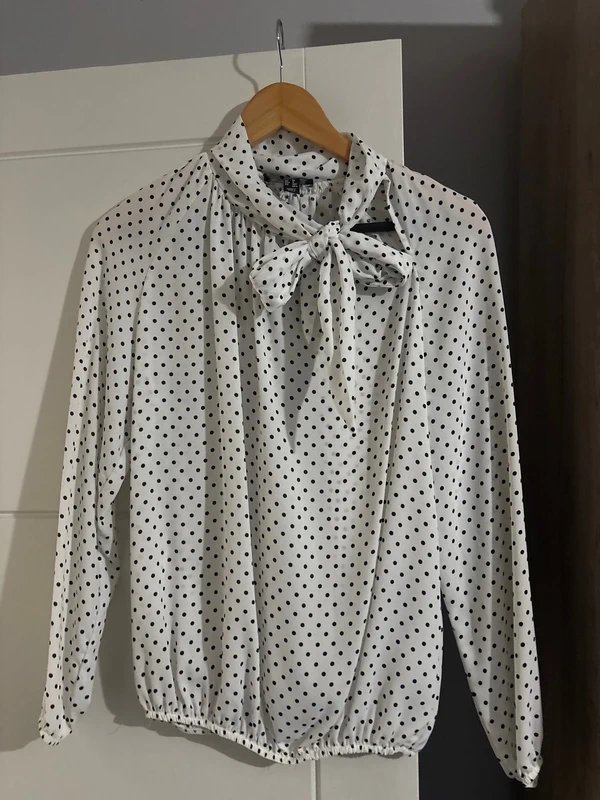 A delicate polka dot chiffon shirt in white and black hues, perfect for adding a touch of whimsy to any outfit.