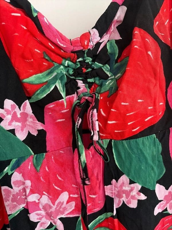 This strawberry-themed summer dress from New Look features a ruched bust and a vibrant floral print. The black and red colour scheme adds a pop of colour, perfect for summer outings.