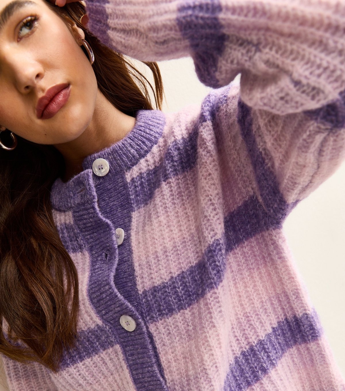 This relaxed-fit cardigan features a stunning purple and pink stripe pattern. It has a crew neckline and fastens with iridescent buttons. The ribbed trim adds a touch of coziness.