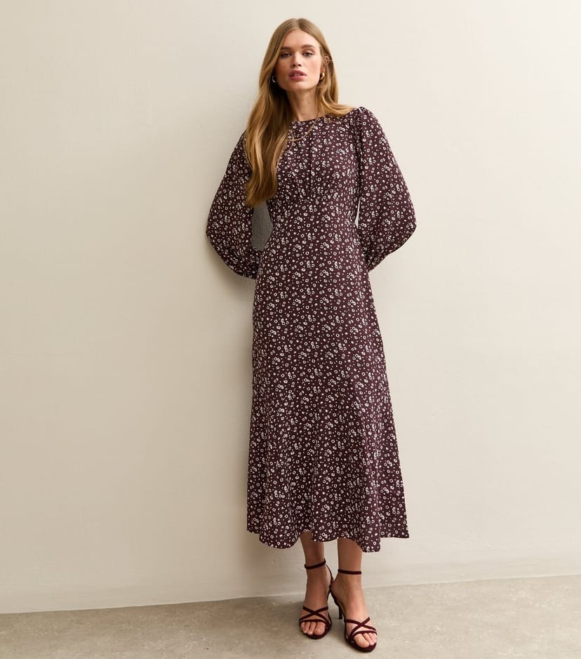 The New Look Burgundy Floral Midi Dress is ideal for casual, semi-formal.