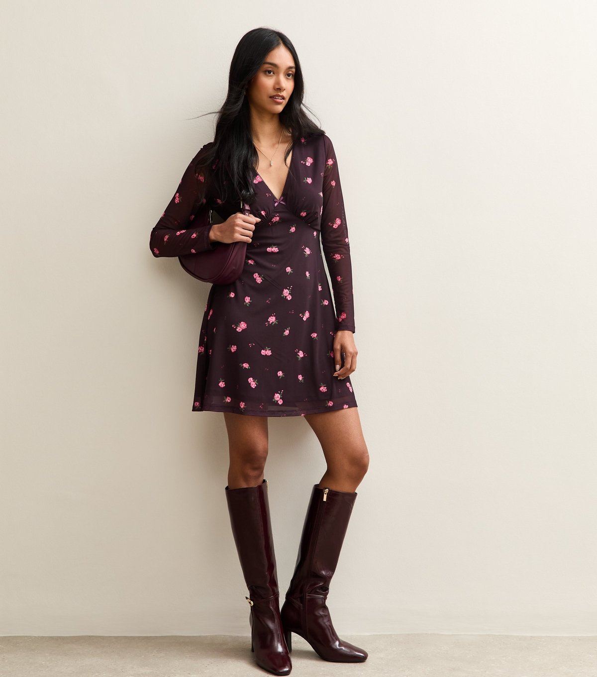 The New Look Dark Burgundy Floral Mesh Mini Dress is ideal for evening, party, date-night.