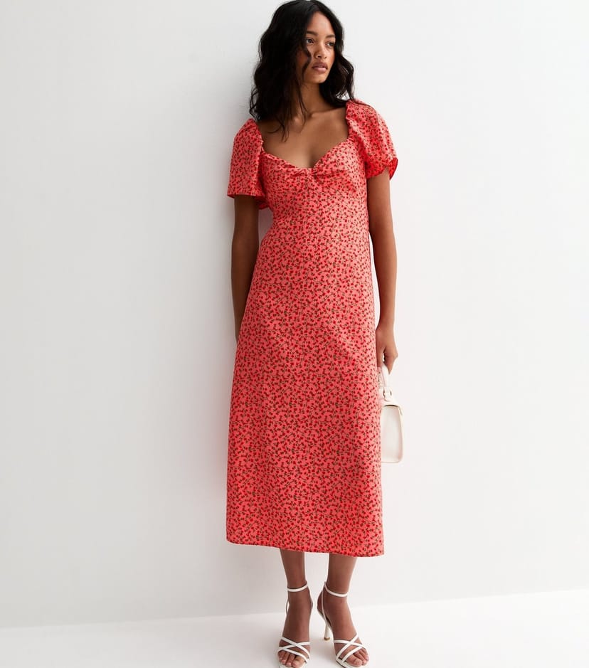The New Look Dark Pink Ditsy Tea Midi Dress is available in sizes 10, 12, 14, 16, 18, 8.