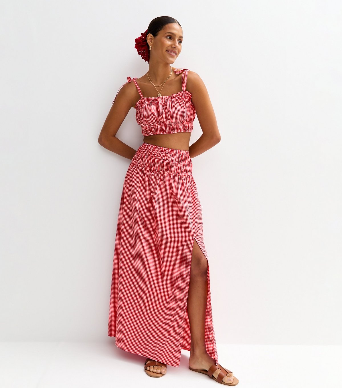 Playful red gingham check maxi skirt with a shirred waistband for comfort. Features a slit hem for a stylish touch. Ideal for summer coordination with matching tops.