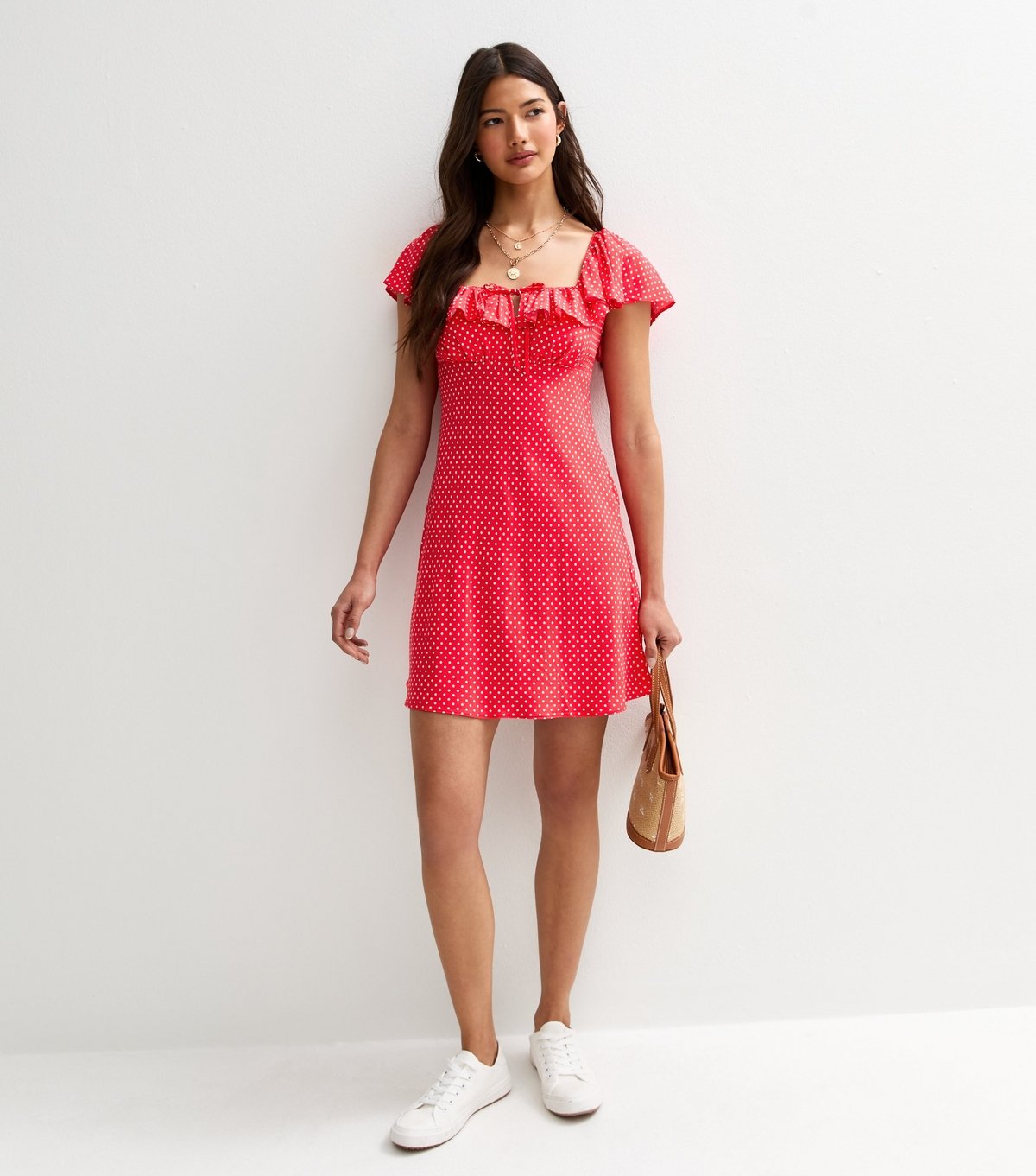 The New Look Red Polka Dot Frill Trim Mini Dress is available in sizes 10, 14, 16, 18, 20, 22.