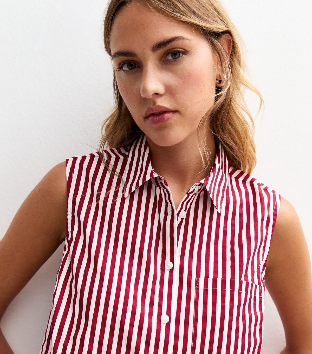 The New Look Red Striped Crop Sleeveless Shirt is made from poplin.
