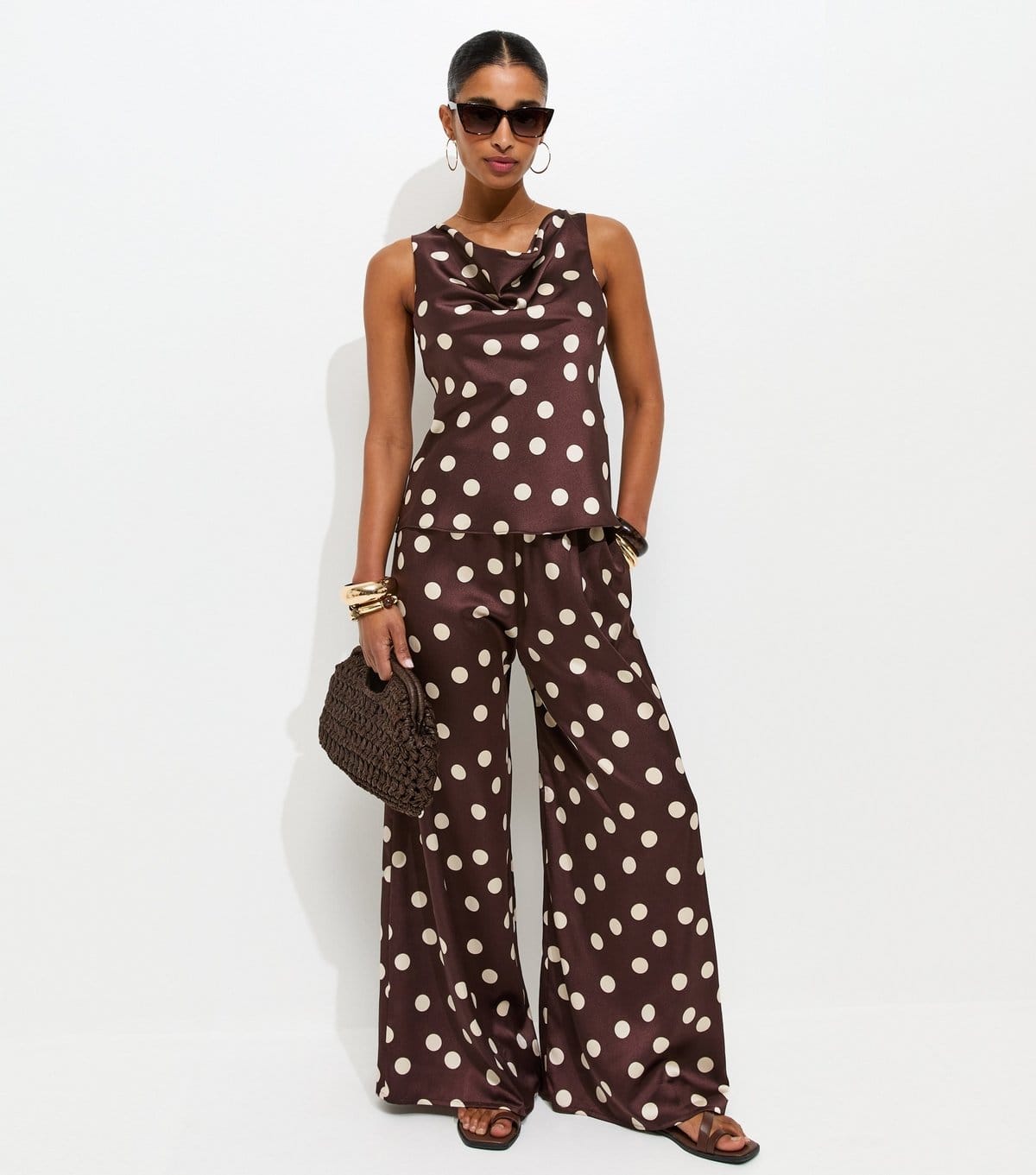 Playful red satin palazzo trousers with a polka dot print. The wide leg silhouette adds a touch of fun to any outfit. Pair with the matching top for a coordinated look.