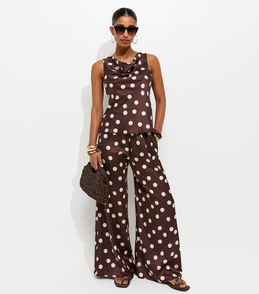 The New Look Red Satin Polka Dot Palazzo Trousers is available in sizes 10, 12, 14, 16, 18, 20, 22, 6, 8.