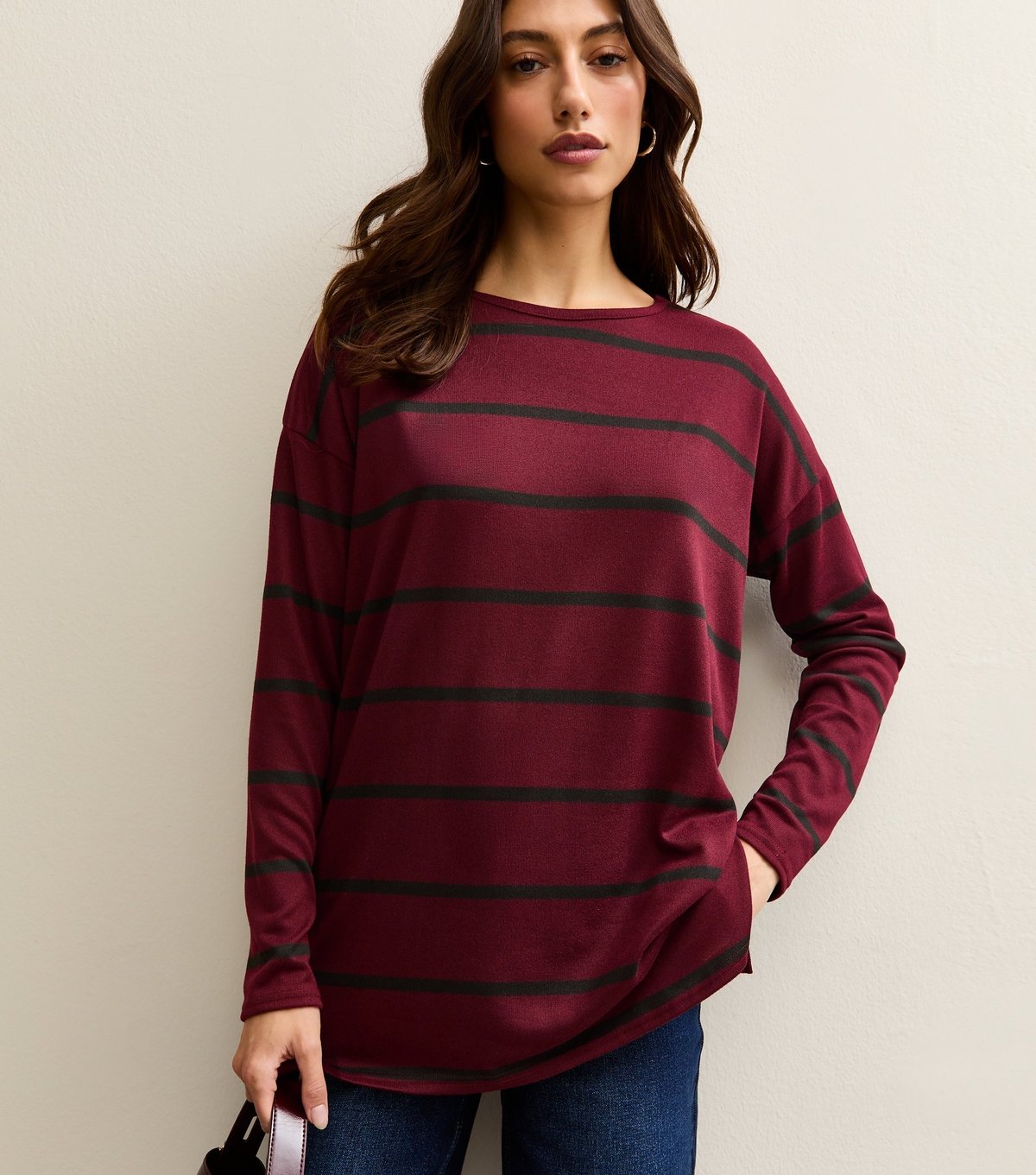 Relaxed and comfy, this burgundy striped long-sleeve top by New Look features a crew neckline and longline fit. Ideal for everyday wear, its dropped shoulders add a touch of casual elegance.