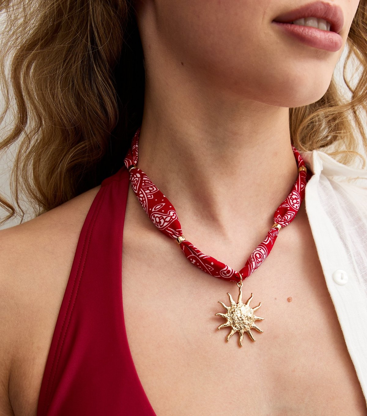 Playful red paisley rope necklace with a textured sunshine pendant. Ideal for festivals or casual outings. The unique charm adds warmth and personality to any look.