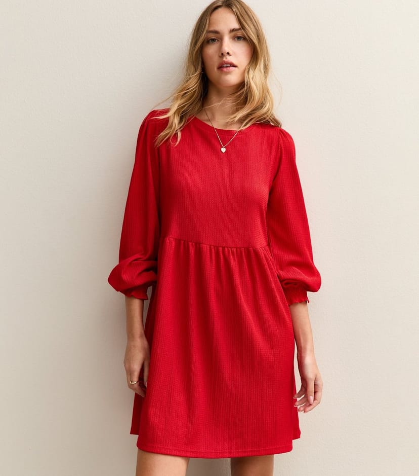 This bright red mini dress by New Look features a textured finish and a smock shape. The relaxed fit and long sleeves make it a versatile piece for any occasion.