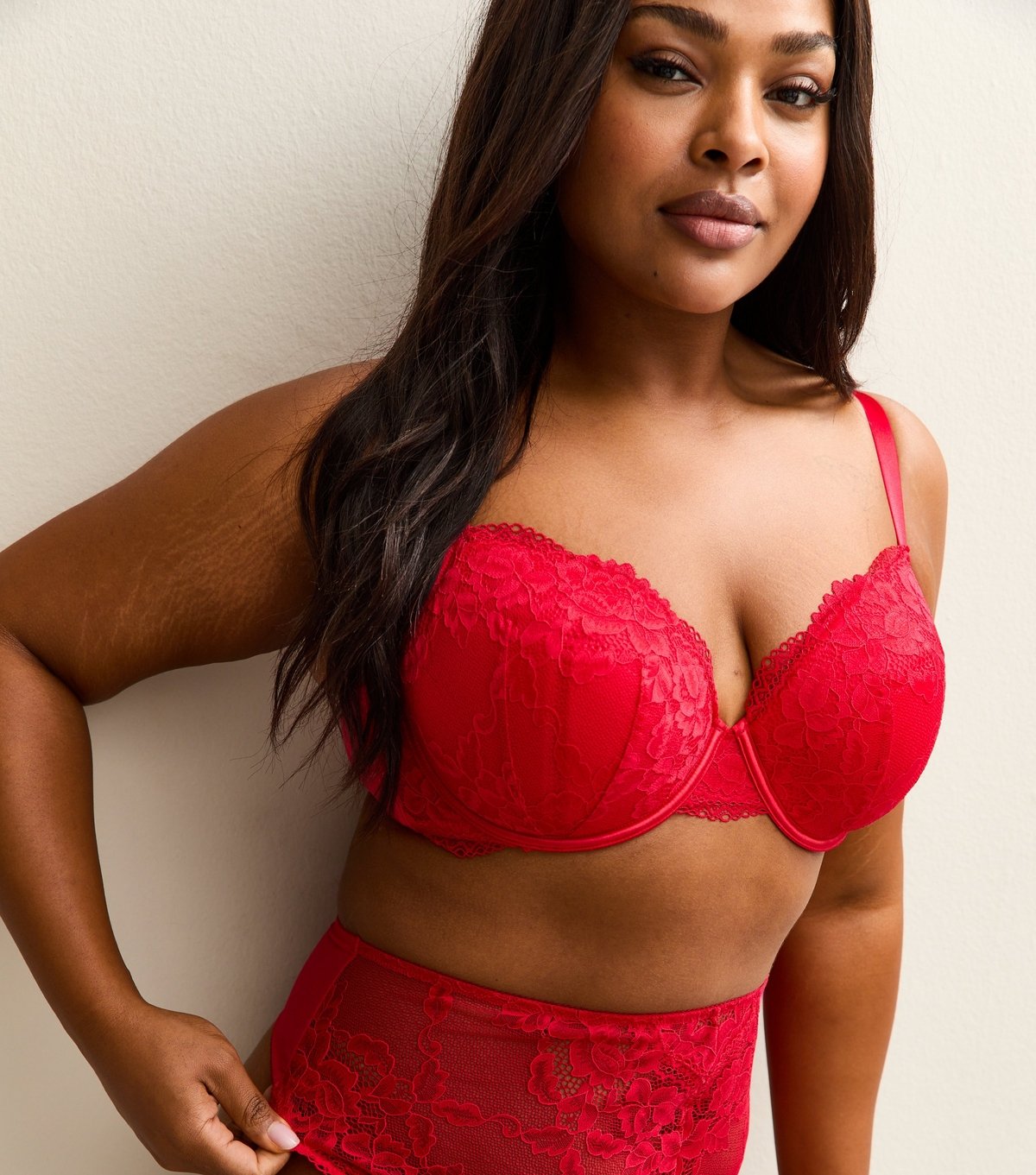 The New Look Red Lace Plunge Bra for Curves is available in sizes 40C, 40D, 40DD, 40E, 42C, 42D, 42DD, 42E, 44C, 44D, 44DD.