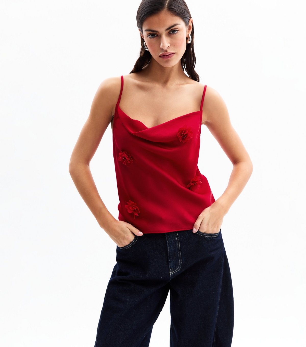This red satin camisole from New Look features a cowl neckline and adjustable straps. The corsage-style appliqué adds a decorative flair, perfect for evening dressing. Pair it with dark denim for a chic look.