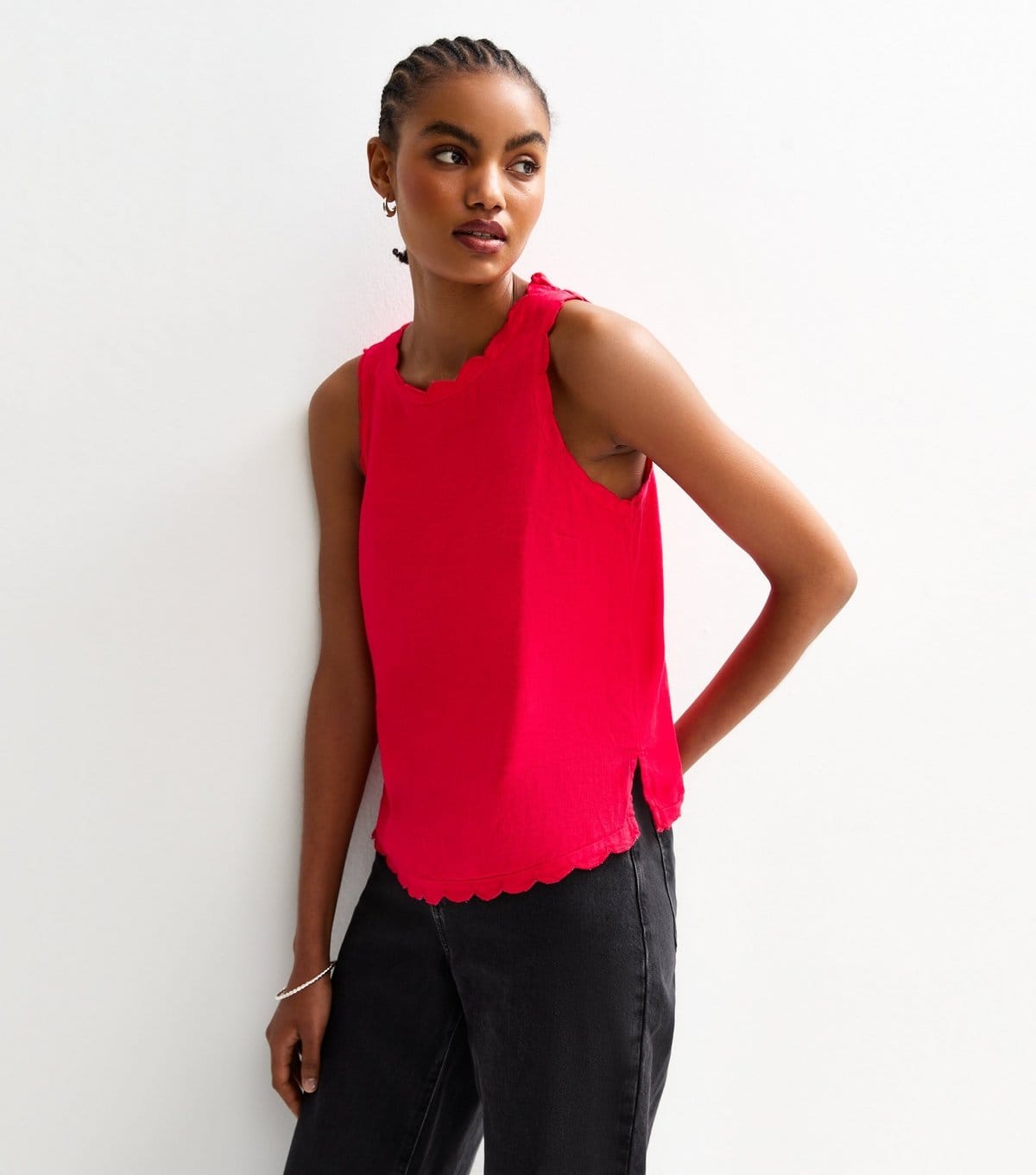 The New Look Red Linen Blend Scalloped Trim Vest is available in sizes 10.