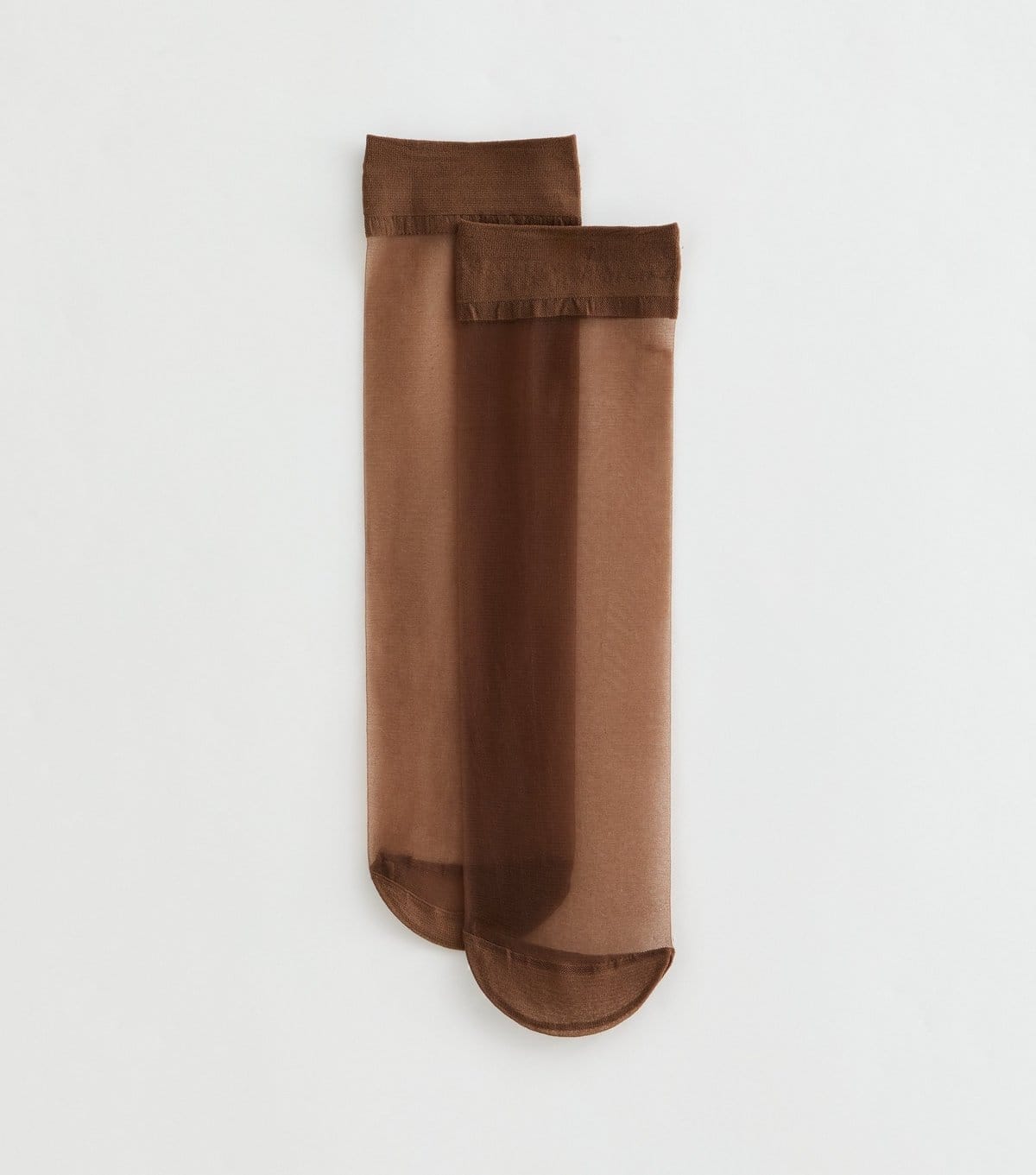 Chic ankle socks in a sheer brown hue. Perfect for adding a touch of elegance to any outfit. Made from low-denier fabric for a delicate finish.