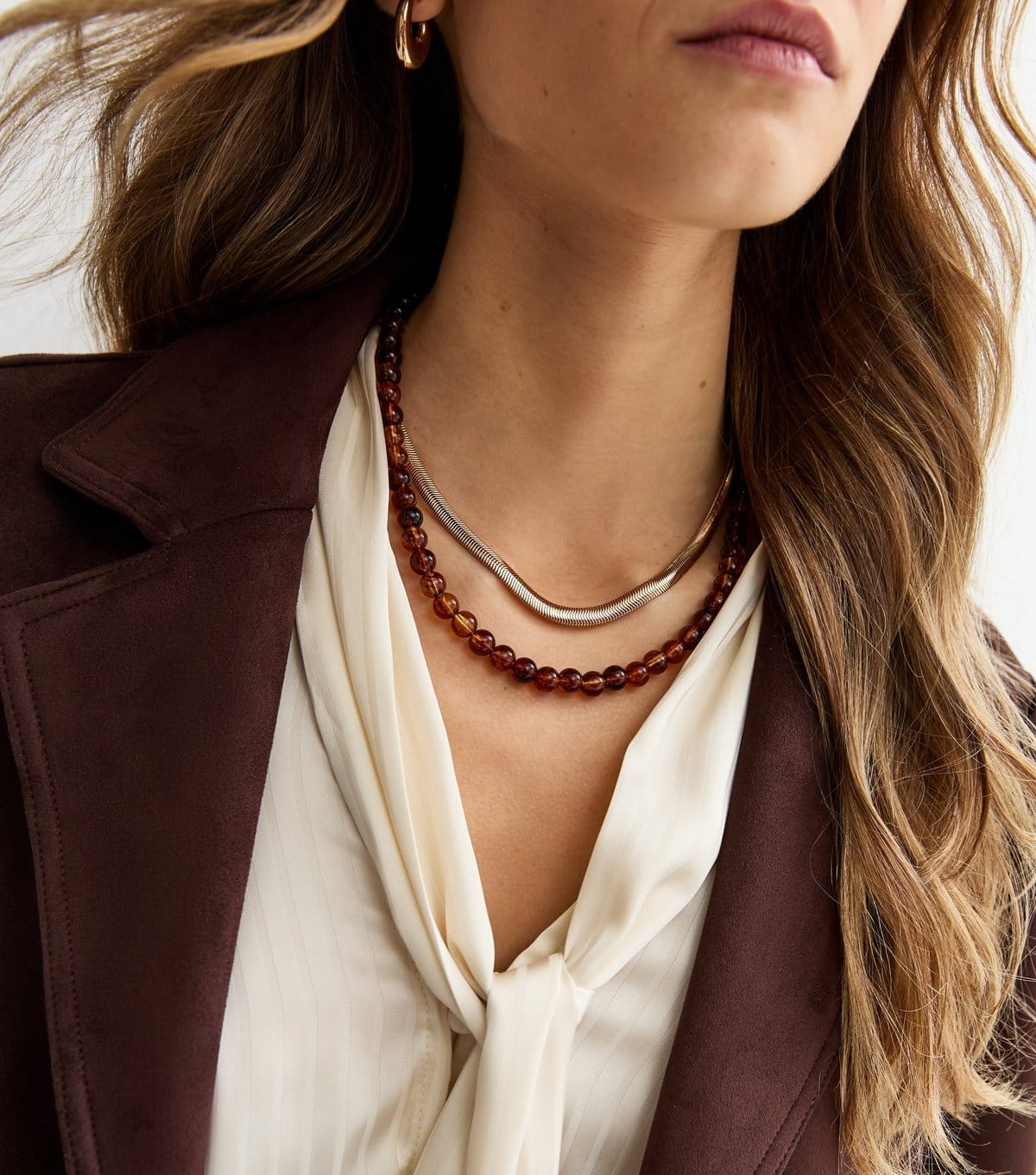This two-layer necklace from New Look features a row of translucent tortoiseshell beads with a glimmering gold tone snake chain. The adjustable lobster clasp ensures a secure fit. Ideal for adding a touch of elegance to any outfit.