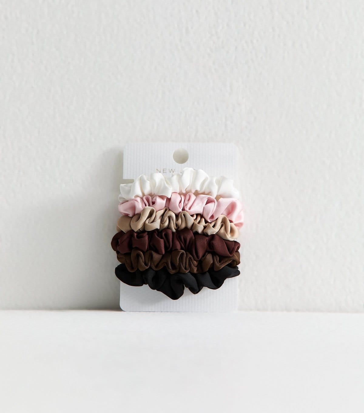 A pack of six multicoloured mini satin scrunchies from New Look. Perfect for styling your hair throughout the week. Available in pink, white, black, and brown.