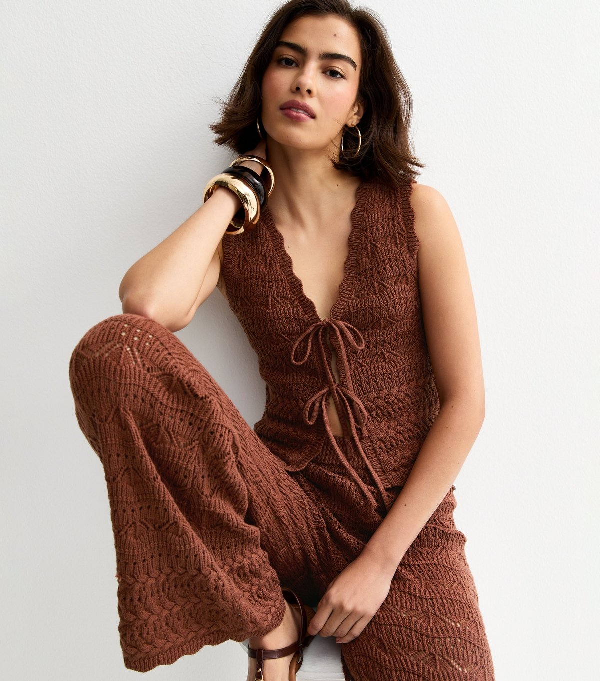 This brown waistcoat features a wavy stitch texture for a textured look. With ties down the front, it can be styled over a tank top for a relaxed vibe. Perfect for layering.