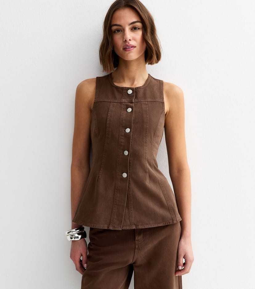 The New Look Brown Denim Peplum Waistcoat is made from denim.
