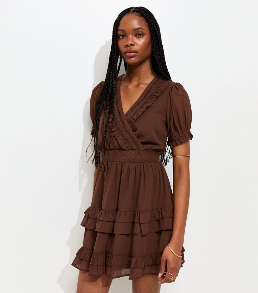 View New Look UK's returns policyThis brown mini dress features a wrap-style V-neckline and short sleeves. The smocked waist and tiered ruffle trims add a touch of femininity, perfect for summer styling.