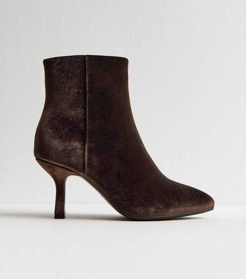 View New Look UK's returns policyChic and sophisticated brown velvet stiletto ankle boots with a pointed toe and stiletto heel. Perfect for elevating your autumnal looks and pairing with thick winter coats.