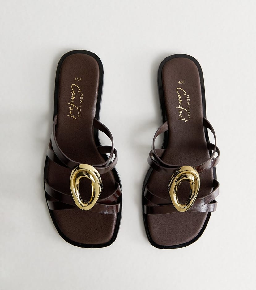 The New Look Rust Brown Gold Buckle Mule Sandals is available in sizes 2, 3, 4, 5, 6, 7, 8.