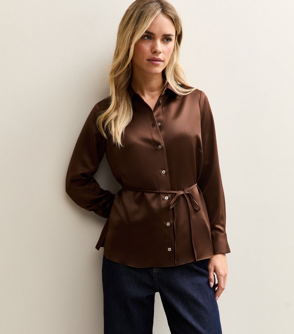 The New Look Brown Satin Longline Shirt for Petite Women is available in sizes 16.