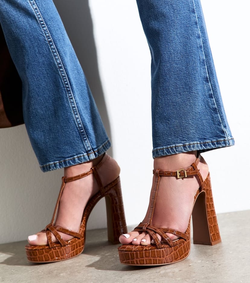 Strut in style with these rust croc-effect platform sandals from New Look. Featuring a bold croc-effect finish and a towering block heel, these sandals bring a touch of 70s glamour to any outfit.