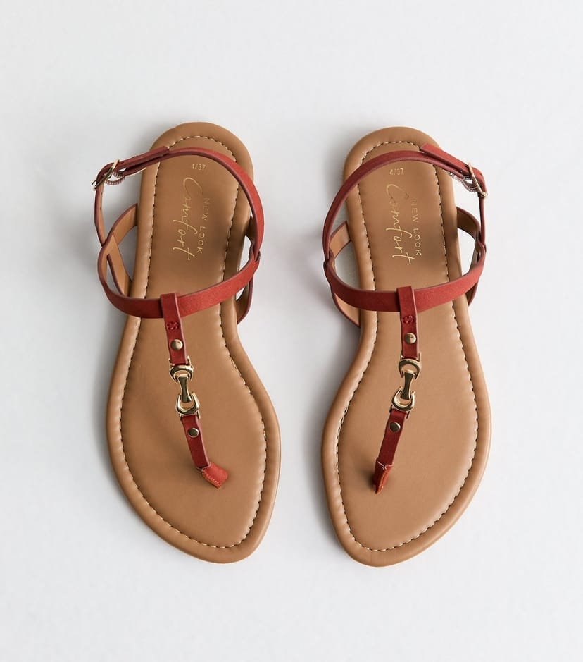 View New Look UK's returns policyThese flat sandals feature a chain detail along the toe post for a glimmering edge. A comfy addition to your summer edit, the rust flats have a slim sole and an adjustable ankle strap for a secure fit. Made with our Comfort features.