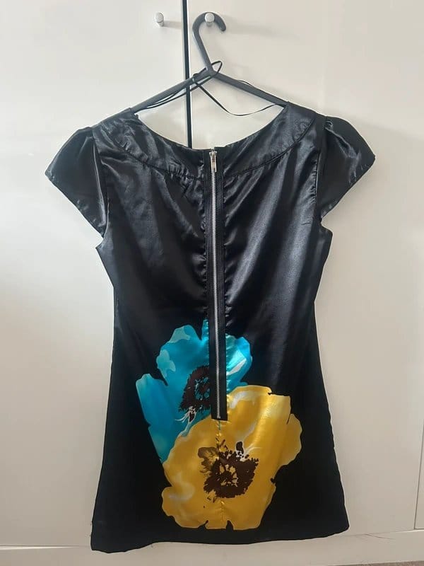 This black silk mini dress features a unique floral print with blue and yellow accents. The sheer fabric adds a touch of elegance, perfect for evening outings.