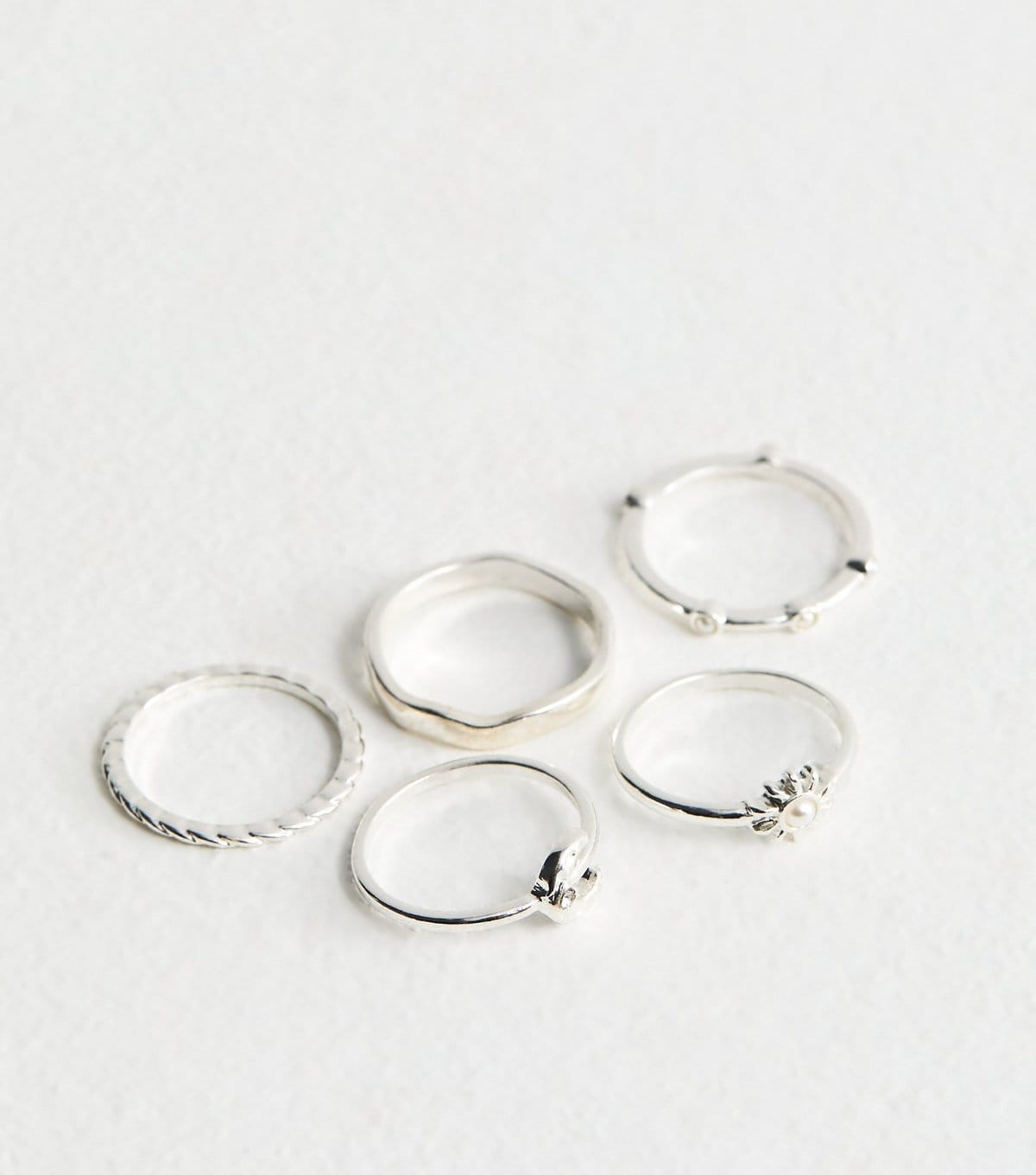 A delightful pack of 5 silver tone rings from New Look. These rings feature sun and moon designs, textured bands, and shimmery faux pearl details. Ideal for adding a touch of celestial charm to your jewellery collection.