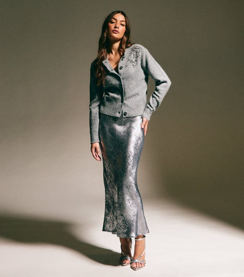 The New Look Silver Metallic Bias Cut Midi Skirt is ideal for evening, party, date-night.