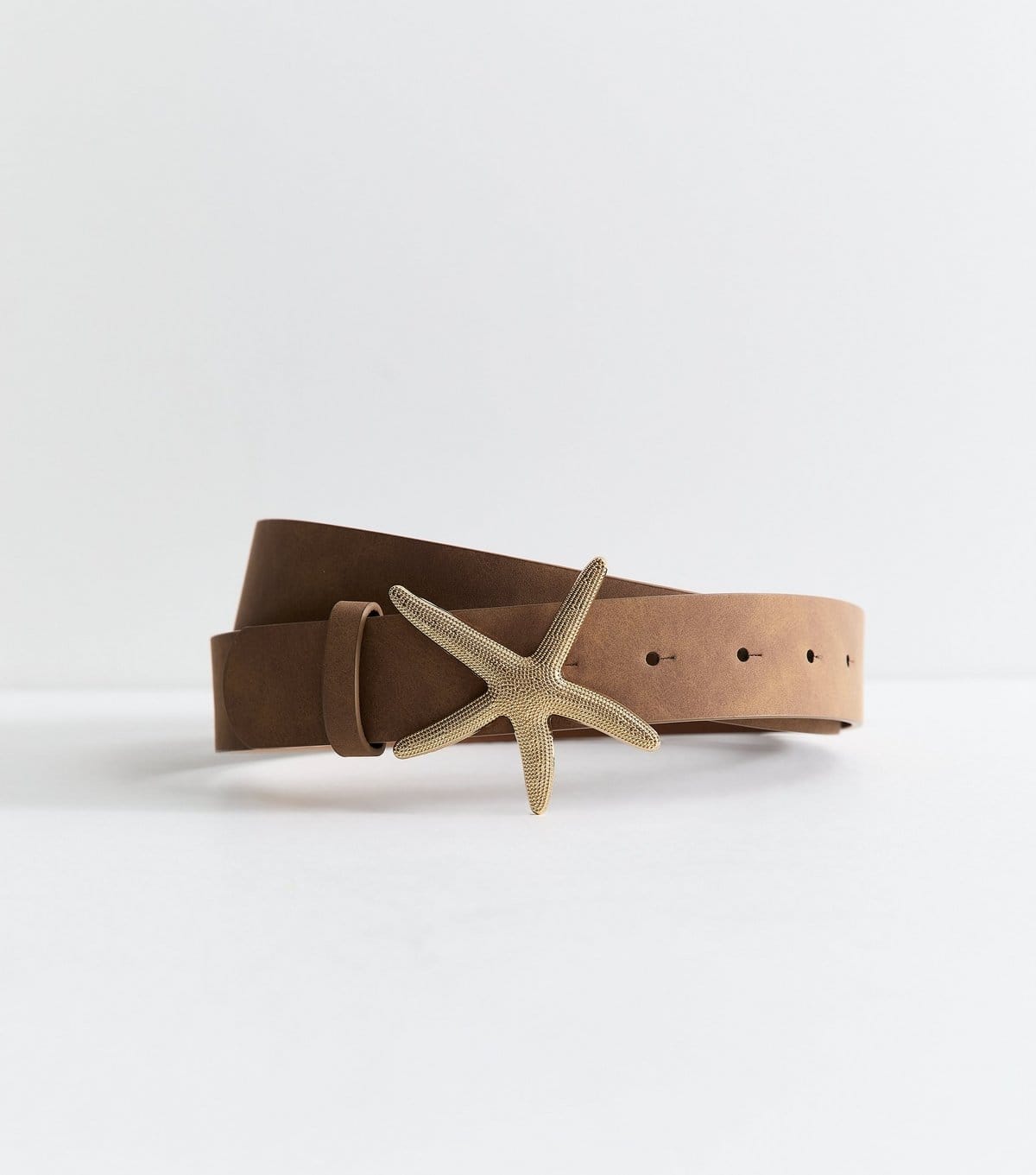 This brown faux suede belt from New Look features a chunky starfish-shaped buckle for a unique touch. Ideal for adding a boho-chic vibe to your outfits.