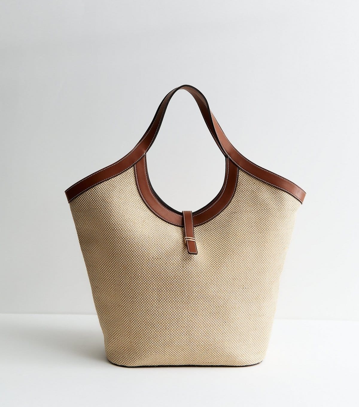 Stylish stone canvas tote bag with faux-leather trim for a polished look. It features flared sides and a rounded top with a press-stud strap for easy fastening.