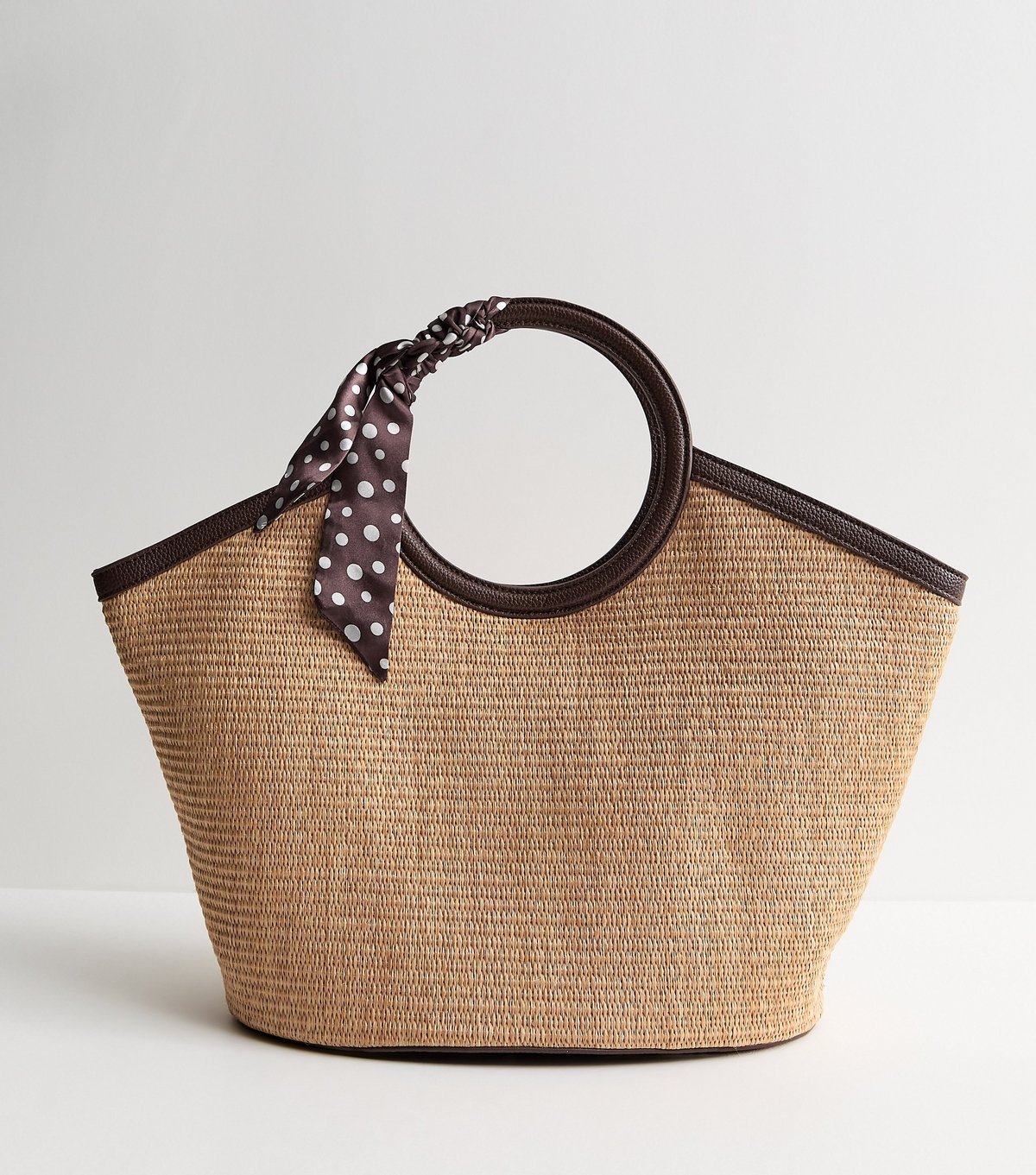 A chic stone basket bag from New Look, perfect for summer. It features round top handles and a fun polka dot scarf. Made from woven material with faux-leather trim, it's ideal for beach days and casual weekends.