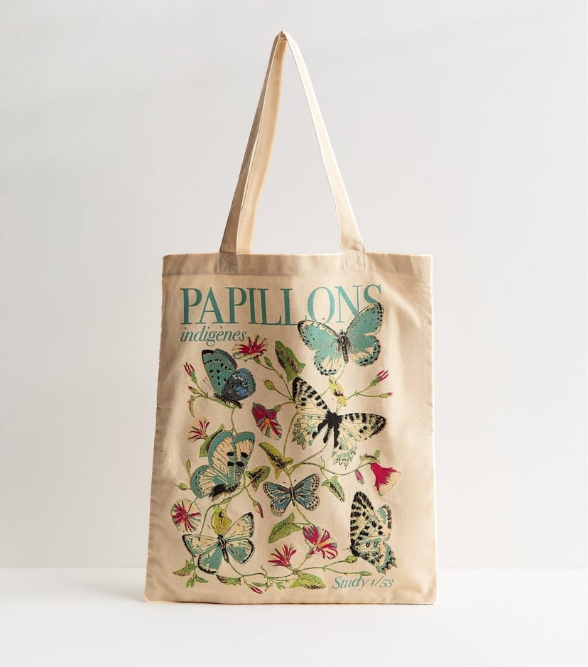 The New Look Stone Butterfly Print Canvas Tote Bag is available in sizes ONE SIZE.