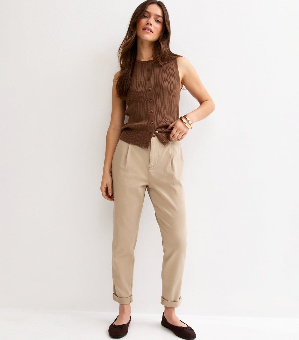See all outfit ideasChic stone chino trousers designed for petite women. Featuring a slim fit, turned-up cuffs, and a mid-rise waist, these trousers are perfect for a spring look. Made from a woven fabric, they offer a comfortable and stylish option for various occasions.