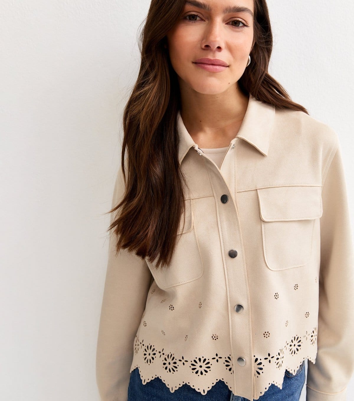 Playful stone faux suede shacket for petite women. Features a cutwork hem and push stud fastenings. Perfect for a short to mid-length style.