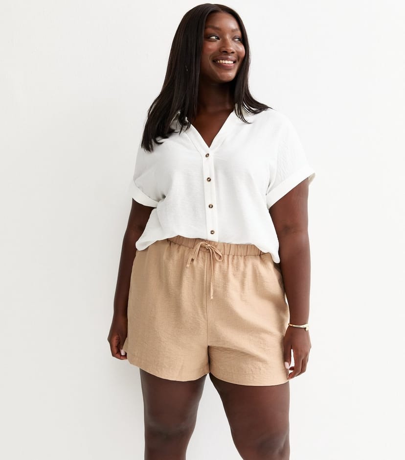 The New Look Stone Crinkled Drawstring Shorts for Women is available in sizes 18, 20, 22, 24, 26, 28, 30, 32.