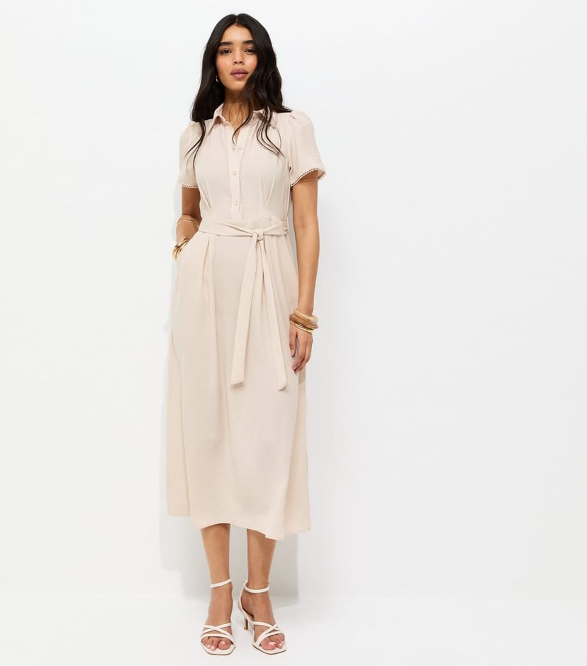 The New Look Stone Frill Trim Midi Dress is available in sizes 10, 12, 14, 16, 18, 20, 22, 6, 8.