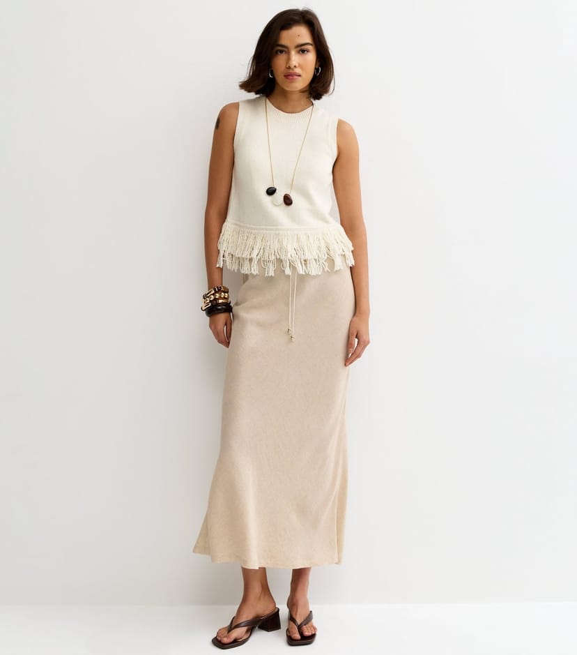The New Look Stone Linen Look Bias Cut Midi Skirt is made from linen look.