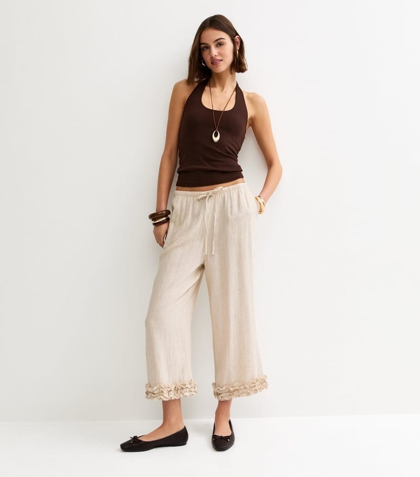 The New Look Stone Linen Look Cropped Ruffle Hem Trousers is available in sizes 10, 12, 14, 16, 18, 20, 6, 8.