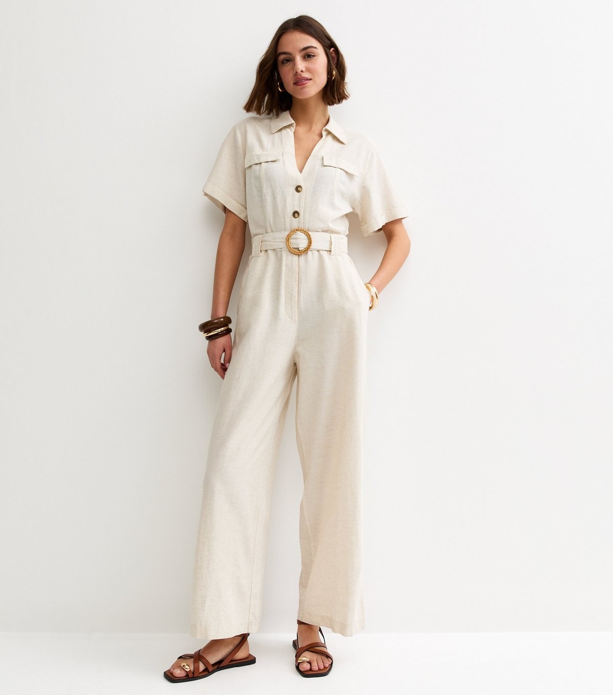 The New Look Stone Belted Jumpsuit is made from linen, cotton.