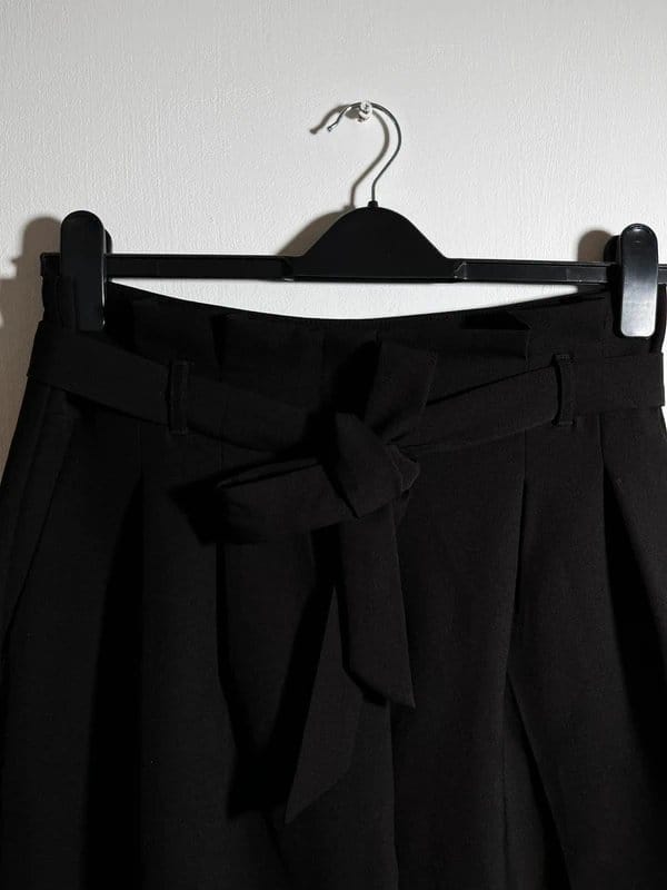 See all outfit ideasStylish black tailored trousers with a high-waisted silhouette, gathered pleated waistband, and tie belt. The slight tapering of the leg adds a modern touch.