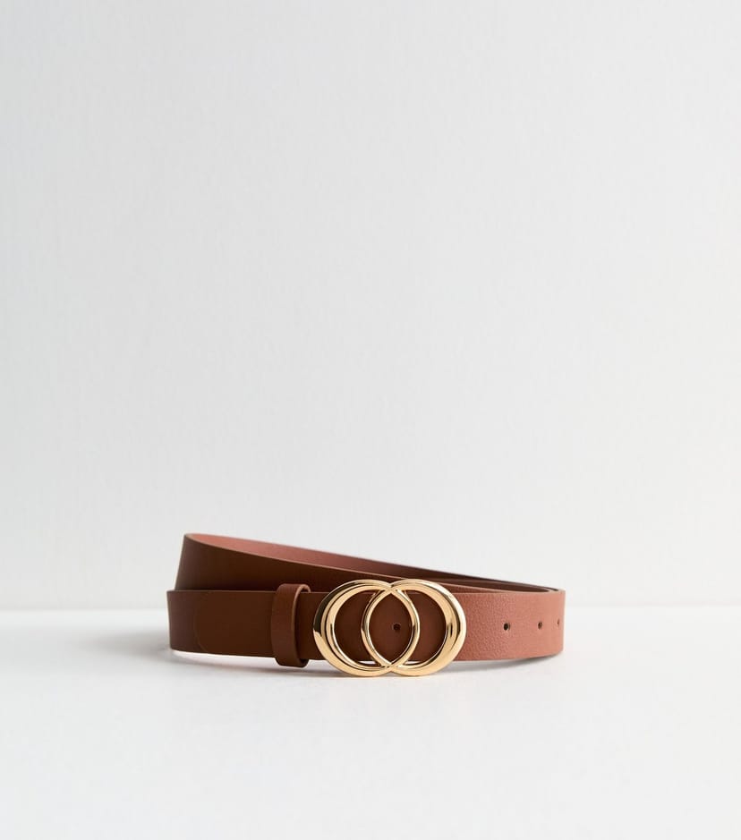 A timeless accessory, this tan leather-look belt from New Look features a curved buckle design and gold-tone hardware. Adjustable for a perfect fit, it's a versatile addition to any wardrobe.