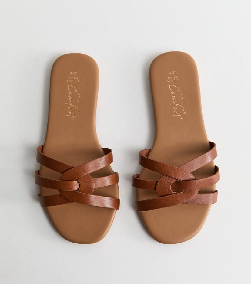 The New Look Tan Faux Leather Flat Mule Sandals is available in sizes SIZE 3 - WIDE FIT, SIZE 4 - WIDE FIT, SIZE 5 - WIDE FIT, SIZE 6 - WIDE FIT, SIZE 7 - WIDE FIT, SIZE 8 - WIDE FIT, SIZE 9 - WIDE FIT.