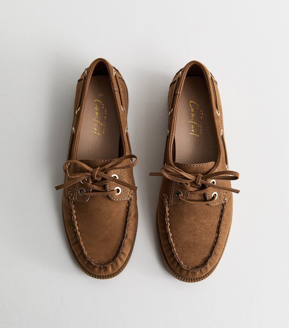 The New Look Tan Brushed Faux Leather Lace-Up Loafers is available in sizes 3, 4, 5, 6, 7, 8, 9.