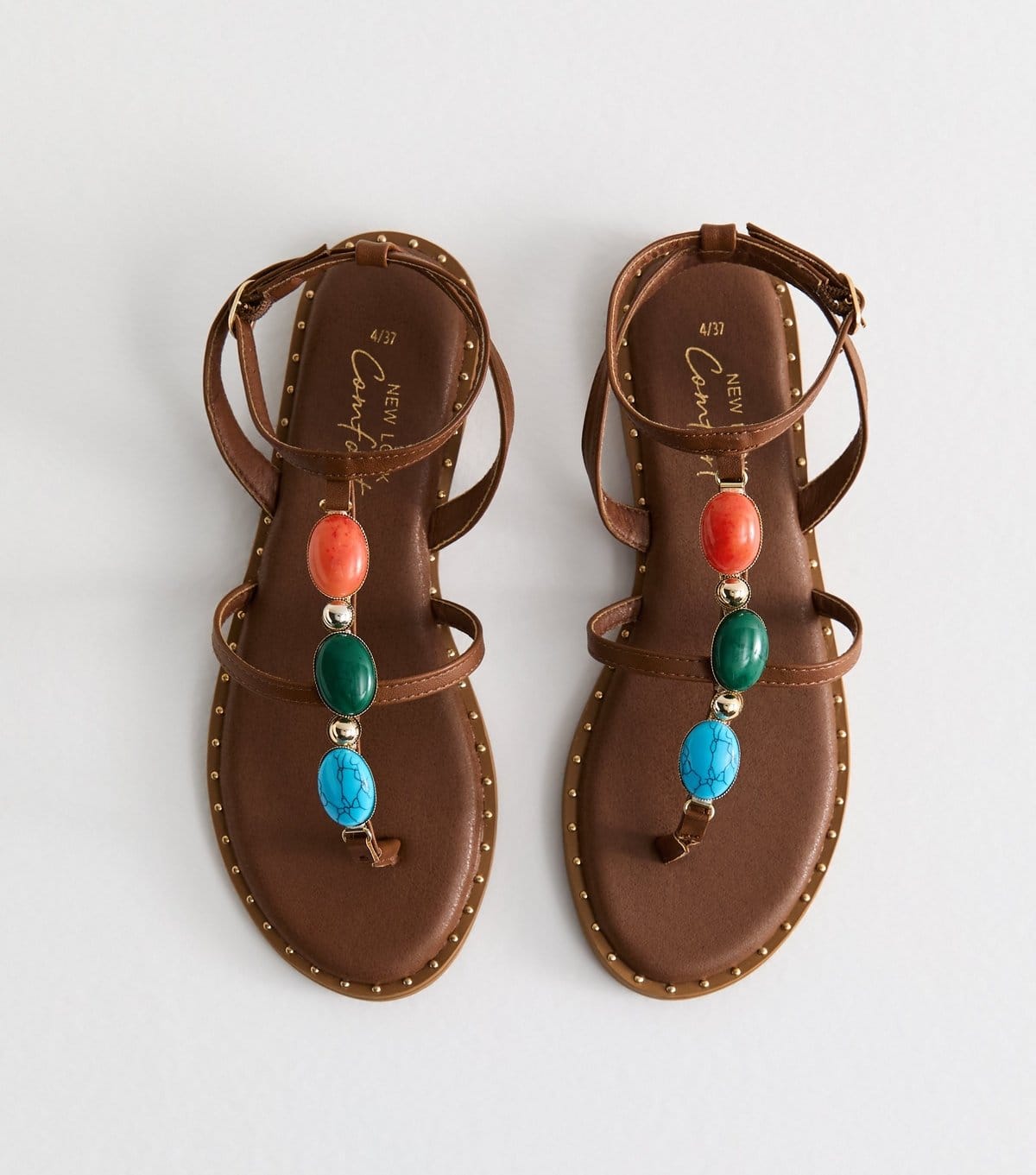 Trendy tan faux leather sandals from New Look, adorned with vibrant stone embellishments along the T-bar strap. Featuring a toe post and gold-tone studs outlining the sole. Perfect for a bohemian look.