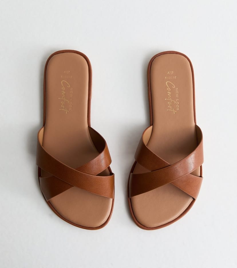 The New Look Tan Faux Leather Crossover Mule Sandals is available in sizes SIZE 4 - WIDE FIT, SIZE 5 - WIDE FIT, SIZE 6 - WIDE FIT, SIZE 7 - WIDE FIT, SIZE 8 - WIDE FIT, SIZE 9 - WIDE FIT.