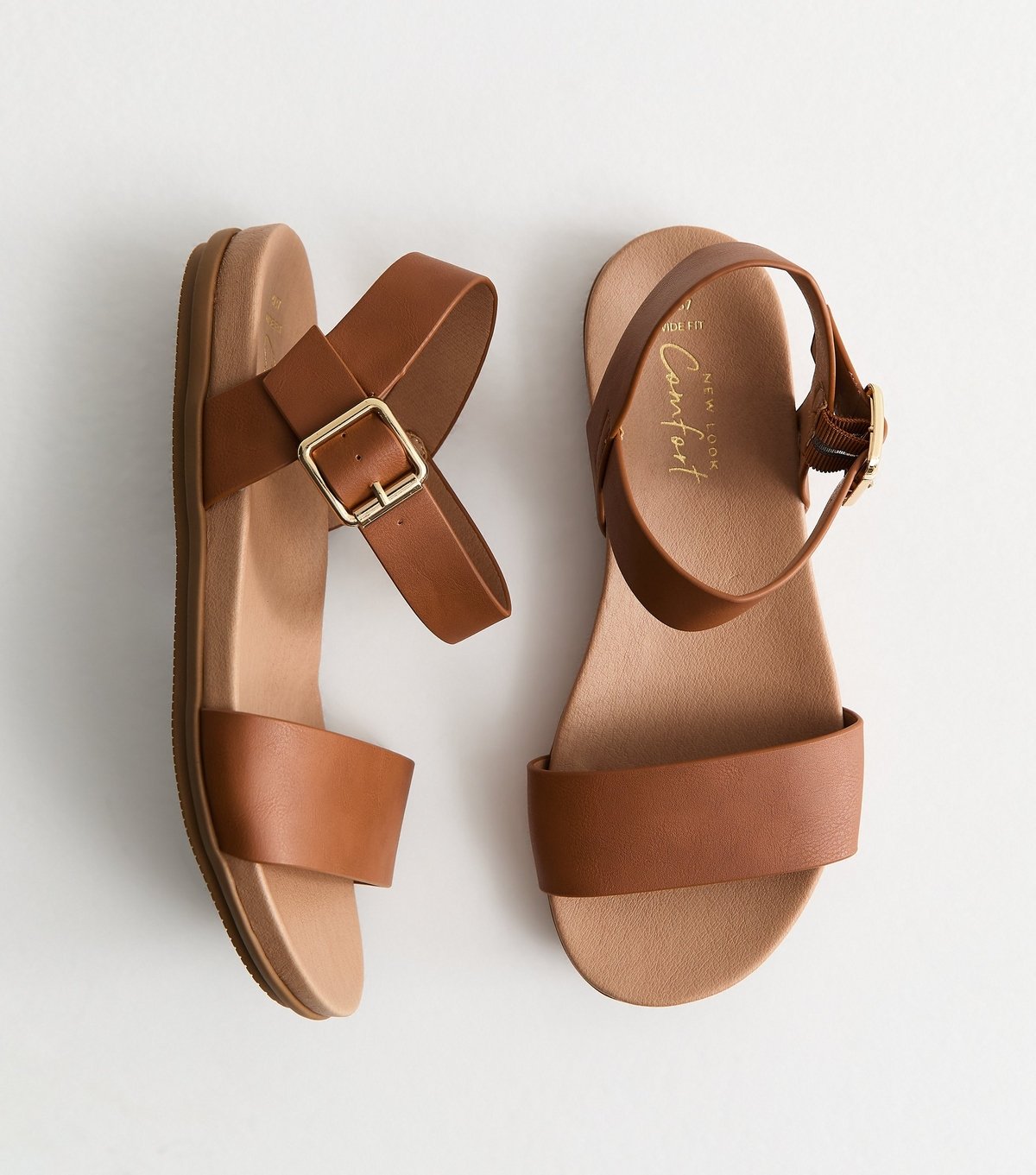 The New Look Tan Faux Leather Flat Sandals Vegan is available in sizes SIZE 3 - WIDE FIT, SIZE 4 - WIDE FIT, SIZE 5 - WIDE FIT, SIZE 6 - WIDE FIT, SIZE 7 - WIDE FIT, SIZE 8 - WIDE FIT, SIZE 9 - WIDE FIT.