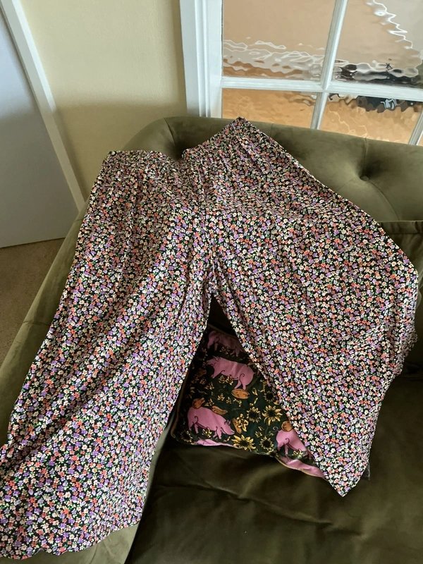Beautiful floral print cropped trousers. One pair with different coloured flowers on a black background with the other pair featuring pink flowers on a black background. Both trousers have side pockets and elasticated waists and are very comfortable. Perfect for spring/summer.